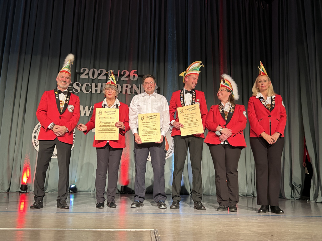 Im Mittelpunkt des Abends – und so, wie es für karnevalistische Eröffnungssitzungen vorgesehen ist – stand die Vereidigung der Mitglieder des Damen- und Herrenkomitees sowie der Ehrensenator:innen, darunter Bürgermeister Adnan Shaikh und Kreistagsvorsitzende Susanne Fritsch. Mit einem kräftigen „Wir geloben es!“ stimmten sie im Chor den Elf Geboten zu, erhielten im Anschluss den Kampagnenorden – dieses Jahr in Form einer Taschenuhr – und setzten dann ihre Narrenkappen auf.